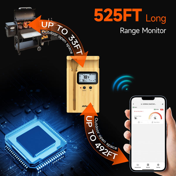 Whether you are grilling outdoors or cooking indoors, Enjoy the Freedom to Relax Up to 525FT Away while Your Meal Cooks Perfectly. you can remotely monitor from anywhere. No need to stay by the grill, you can enjoy the party while ensuring that the food is cooked to perfection