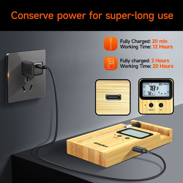 The wifi wireless thermometer has a Type-C port and can be quickly charged through various devices, including power banks, RV power supplies, etc. A full charge can be used for more than 12 hours to meet long-term cooking needs