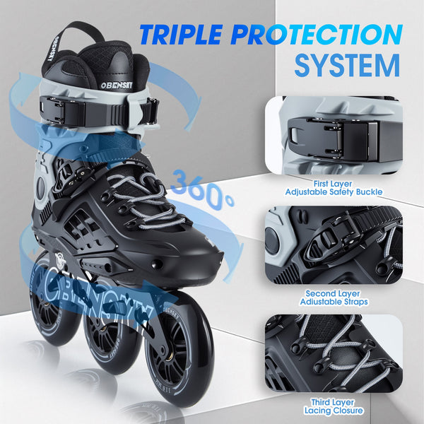 【TRIPLE PROTECTION SYSTEM】The safety buckle, adjustable strap and laces closure can help fasten the feet properly into the skates, while skating it can create an additional wrapping effect. The secure closure system provides better support and professional security for skating.