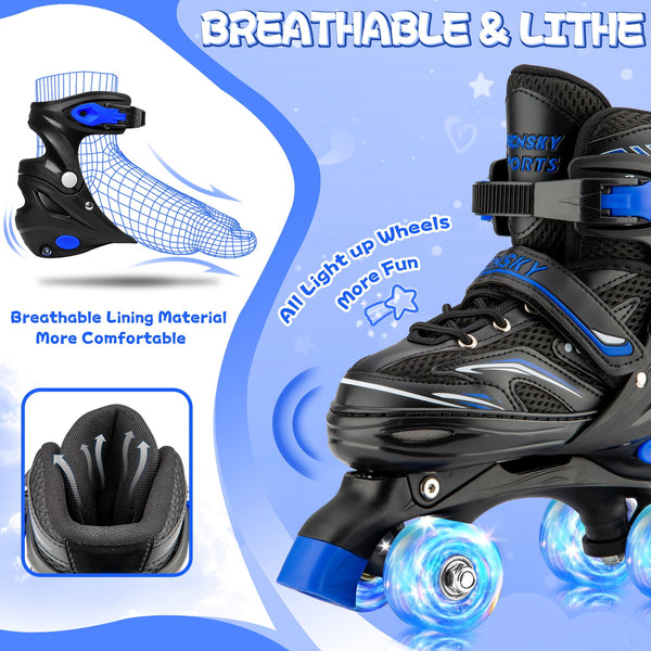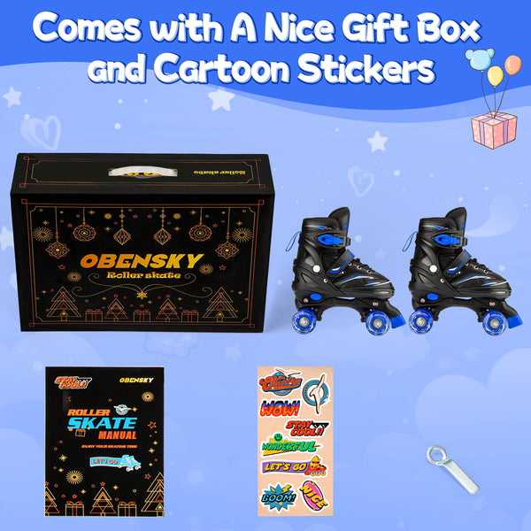 4 SIZE ADJUSTABLE: Easy and convenient 1 push button to adjust different sizes, OBENSKY roller skates for kids toddler can be adjusted to 4 different sizes to fit different foot lengths easily. They are perfect choice for your kid's growing feet. We have 3 sizes (S/M/L) for choosing, please must confirm the size before placing the order.