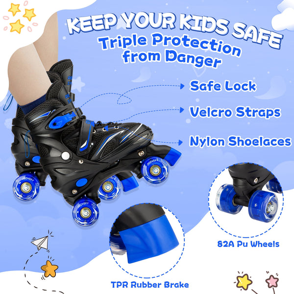 4 SIZE ADJUSTABLE: Easy and convenient 1 push button to adjust different sizes, OBENSKY roller skates for kids toddler can be adjusted to 4 different sizes to fit different foot lengths easily. They are perfect choice for your kid's growing feet. We have 3 sizes (S/M/L) for choosing, please must confirm the size before placing the order.