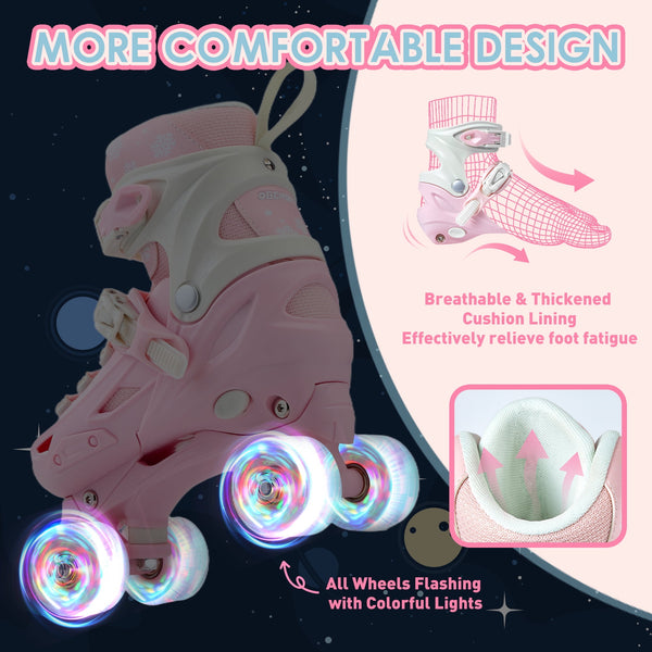 【4 Size Adjustable】 The roller skates are designed with 4 adjustable sizes to different foot lengths. It can be adjusted by press one button. The perfect choice for your growing children.Please select the right size for your kids.