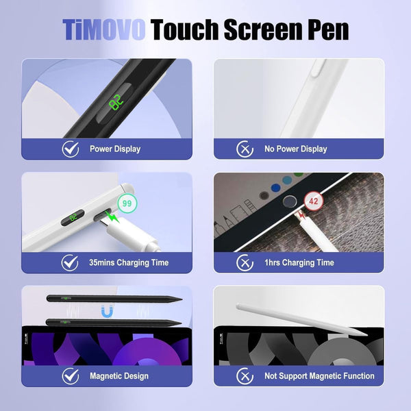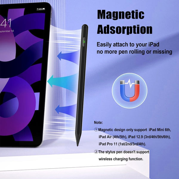 1. Wide Compatibility: Stylus pen compatible for iPad 6th–10th Gen, iPad Air 11/13 M2/M3, iPad Pro 11/13 M4, iPad Pro 12.9", iPhone, Samsung (non-S Pen), and most iOS/Android tablets and smartphones. One pen works for multiple devices. 2. Important Notes: Not compatible with Microsoft, Windows, Laptop, Amazon Fire, Kindle, Chromebook, HP, EMR screens (including Samsung Galaxy S series), or devices with MPP/USI protocol. No palm rejection or tilt pressure sensing. 3. LED Power Display: Built-in LED shows real-time battery level. Tap the top switch to check power anytime; auto-saves after 4 seconds. Always know your battery status. 4. Fast Charging & Auto-Sleep: Type-C charging fully charges in 30–35 minutes for up to 10 hours use and 90 days standby. Auto-sleep after 5 minutes of inactivity saves energy. 5. High Precision & Smooth Writing: Precise tip ensures accurate, lag-free strokes for writing, drawing, painting, or gaming. Package includes 1 stylus pen, 4 replaceable nibs, 1 dust plug, 1 Type-C charging cable, and 1 user manual.