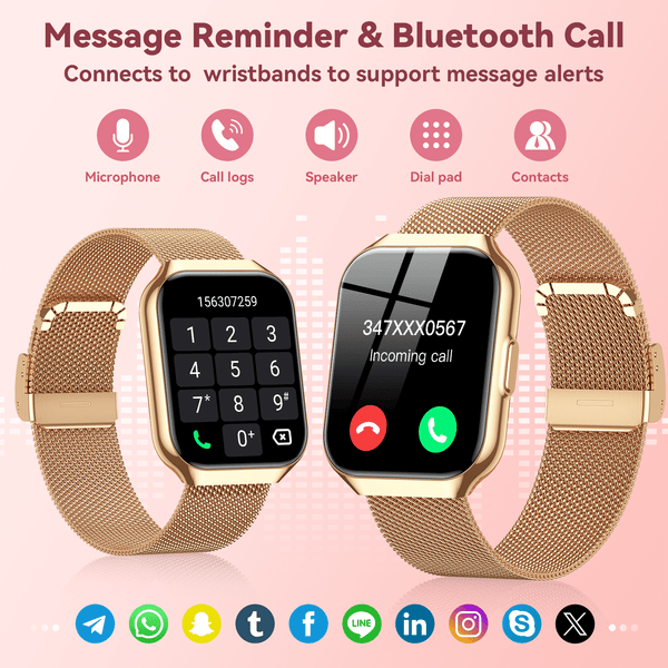 Smart watches for women adopts a larger screen design, and come with three watch bands of different colors. The bright golden frame and golden stainless steel strap perfectly enhance the elegance of the overall outfit.
