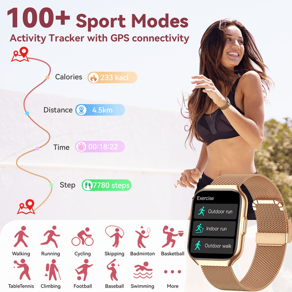 Discover over 100 sports modes available in the app. The activity tracker records exercise duration, calories burned, steps taken, distance covered, and more. The smartwatch is water resistant for daily life, such as washing hands, wearing on rainy days and etc. It should not be worn during bathing, diving, or saunas and so on.